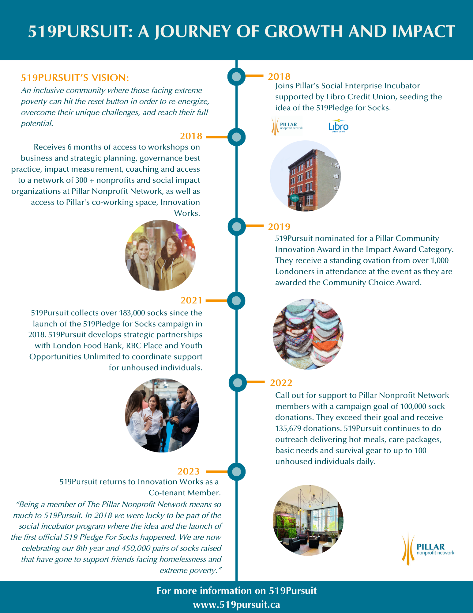 519Pursuit first got involved with Pillar and Innovation Works through the Libro Social Enterprise Incubator program supported by Libro Credit Union. During this time, the idea of the 519Pledge for Socks campaign was imagined. Thanks to the connections made by being a Pillar member, 519Pursuit developed partnerships with the London Food Bank. RBC Place, and Youth Opportunities Unlimited to coordinate support for unhoused individuals. In 2023, 519Pursuit returned to Innovation Works as a co-tenant. Now in their 8th year, 519Pursuit has raised 450,000 pairs of socks for individuals facing homelessness and extreme poverty. 519Pursuit's story is one of many that demonstrates the value of having a space where community collaboration can thrive.