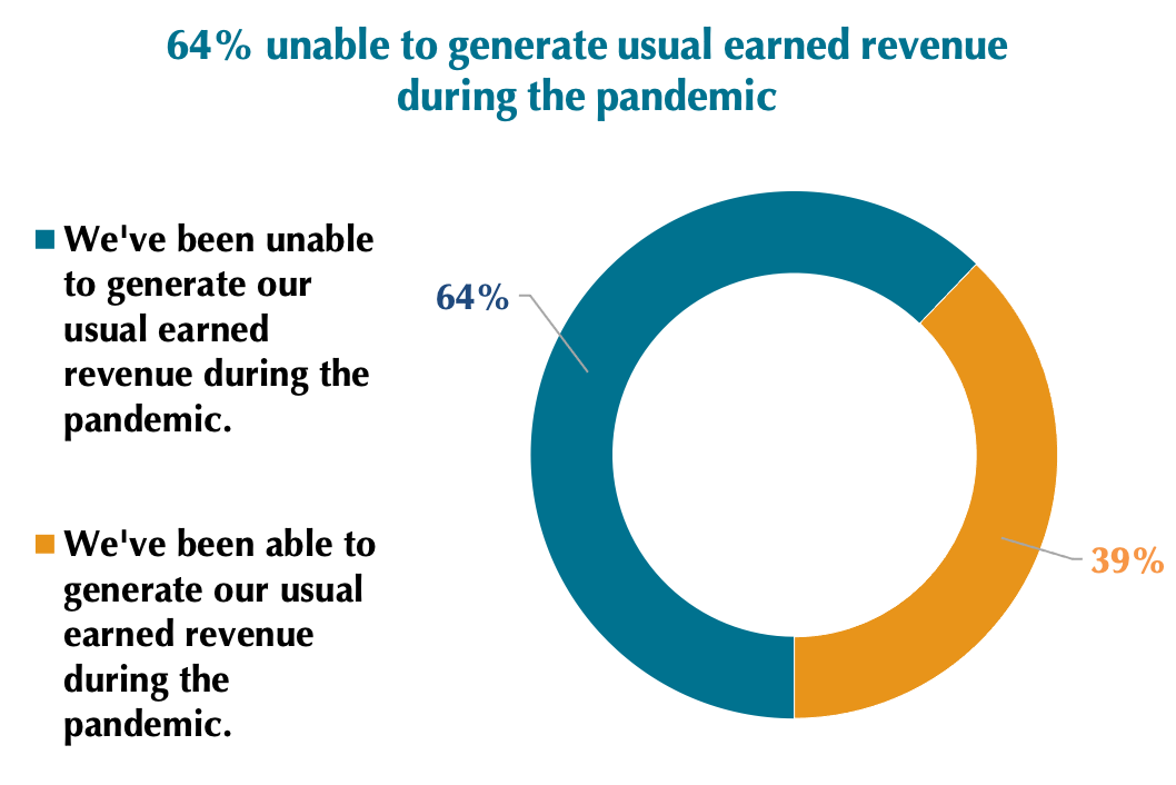 • 64% were unable to generate their usual earned revenue during the pandemic, rising to 83% for small nonprofits