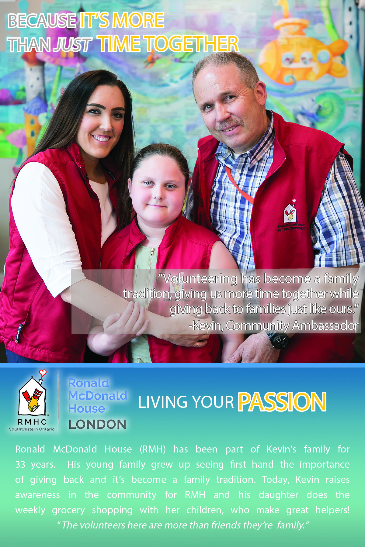In April of 2019, RMHC-SWO officially launched our first ever Volunteer Spotlight, which mirrors the McHappy Day Family Campaign and the posters distributed in McDonald's stores throughout Southwestern Ontario in May. This Volunteer Spotlight focuses on five key RMHC-SWO volunteer roles and highlights both individuals and group volunteers. Two examples of volunteer roles include; three generations from one family who helps families like their own and a group of passionate people who prepare and provide nourishment through weekly meals. These volunteers, like so many who give their time and talents share a strong passion and connection to RMH. The Volunteer Spotlights feature marketing materials such as; posters and postcards with volunteer information that are used for recruitment purposes and fostering awareness throughout the community at events. These featured volunteers and roles are also highlighted on our on website, social medial and in various marketing strategies over the year.