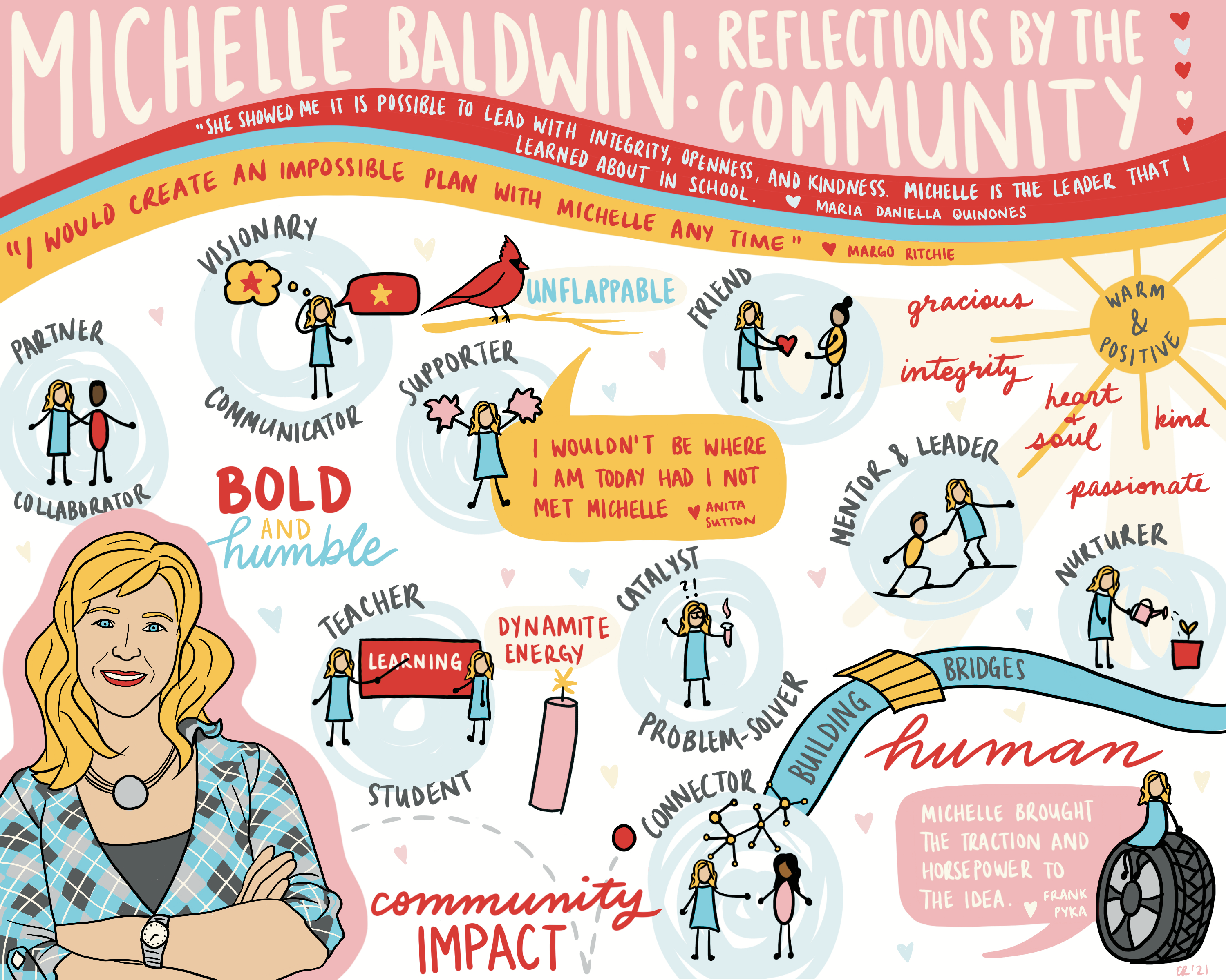 Michelle’s reputation precedes her as a heart-centered leader and passionate advocate for our community; anyone who knows her would say she lives up to that description. It has been a privilege to learn from and collaborate with Michelle, and there is no way to capture all the lessons she has shared and modeled, but I will highlight a few.