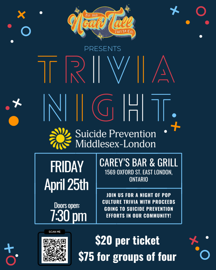 All proceeds will go to Suicide Prevention Middlesex-London.