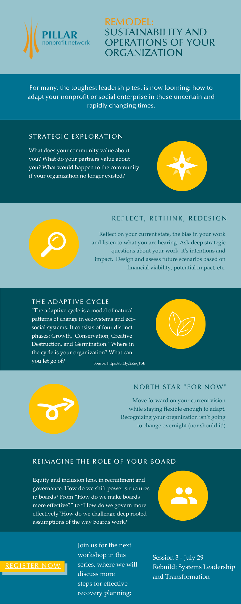 The information in this session was presented by Rachel Berdan (Pillar Nonprofit Network), Julie Forrester (Impact Consulting) and Michelle Baldwin (Pillar Nonprofit Network), as part of a 3 part series called Recovery Post COVID-19: Re-entry, Remodel and Rebuild.