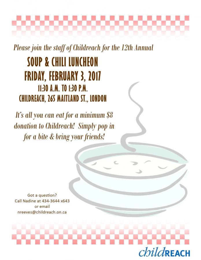It’s that time again! We hope you will join us at Childreach (265 Maitland Street) on Friday, February 3 for our 12th Annual Soup & Chili Lunch between 11:30 a.m. and 1:30 p.m. As always, it is all-you-can-eat soup and chili for a minimum donation of $8 to Childreach. Bring your friends, family and colleagues! We can’t eat it all by ourselves.