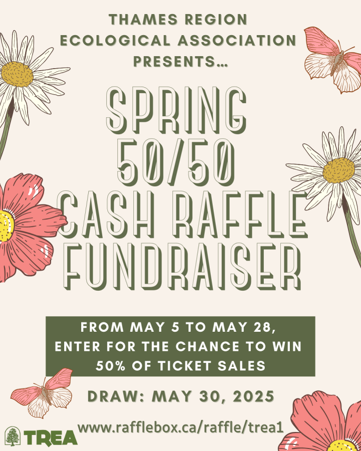 Thames Region Ecological Association is having a Spring 50/50 Cash Raffle Fundraiser! Buy your tickets online at www.rafflebox.ca/raffle/trea1 from May 5 to 28. Draw is online and on May 30, 2025. Win 50% of total ticket sales! A variety of ticket packages are available.