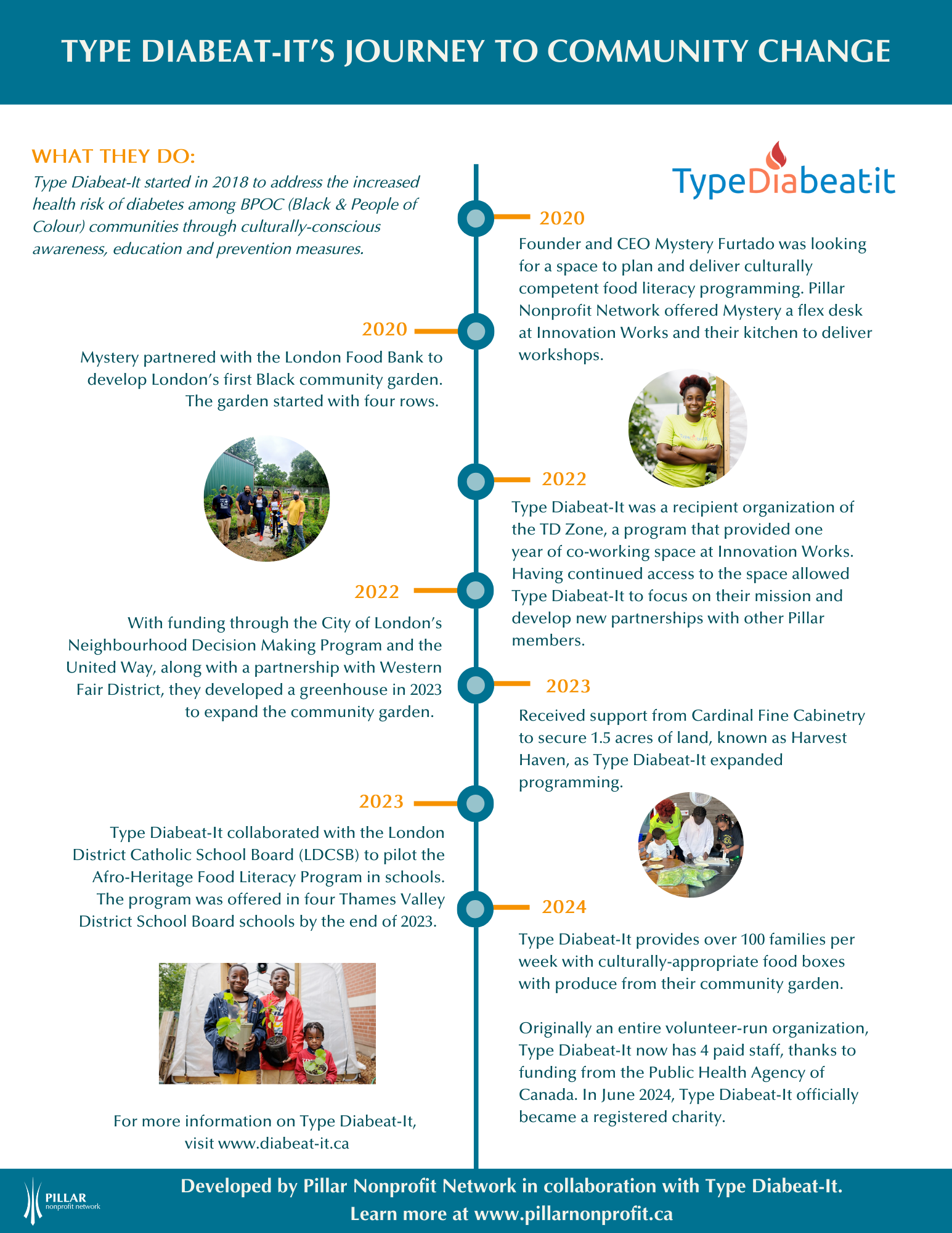 Since 2018, Type Diabeat-It has focused on addressing diabetes risks in BPOC communities. During the pandemic, Mystery was looking for space where she could hold cooking classes. Pillar Nonprofit Network was glad to offer Mystery use of the second floor kitchen and flex desk space at Innovation Works. Membership allowed Mystery to make many connections, and shortly after developed a partnership with the London Food Bank to start London's first Black community garden.