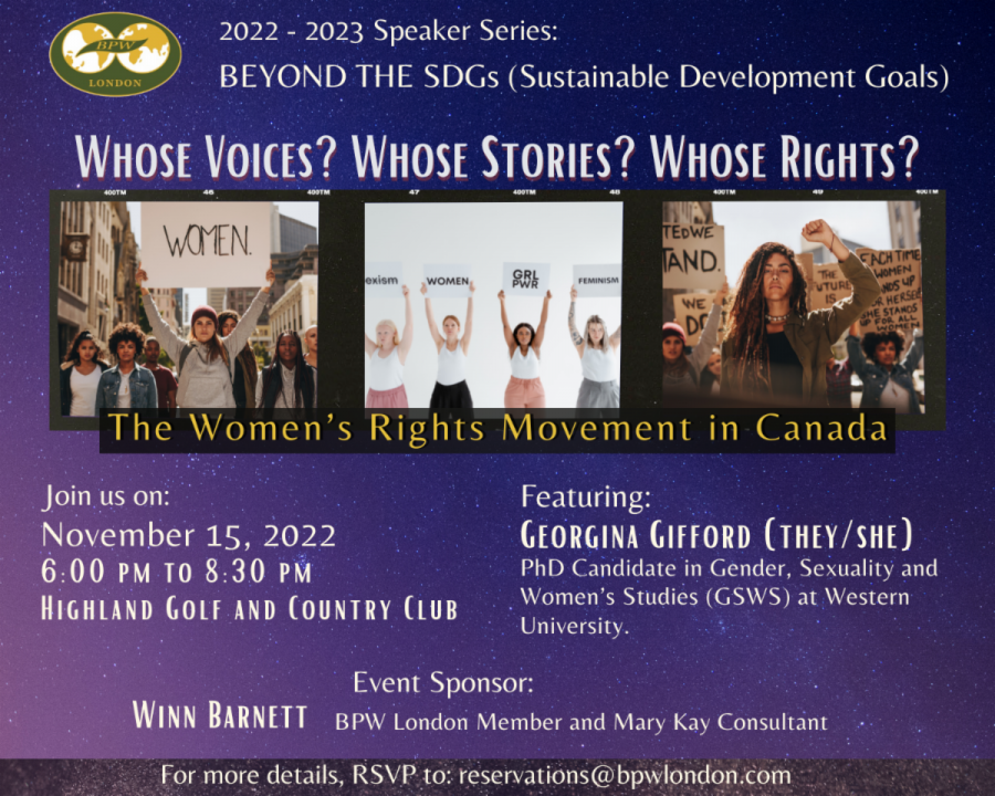 Georgina Gifford is a PHD candidate in Gender, Sexuality & Women’s Studies at Western University. Her talk will address how the feminist movement helped some and left others behind. Please join us for dinner (order from the menu) and our speaker to learn more about how we can work for change for all women.